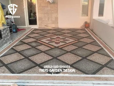 Pola garis-garis atau bentuk simetris seperti kotak dan lingkaran memberikan kesan modern dan minimalis pada lantai. Pola ini sering digunakan untuk area carport dan teras.